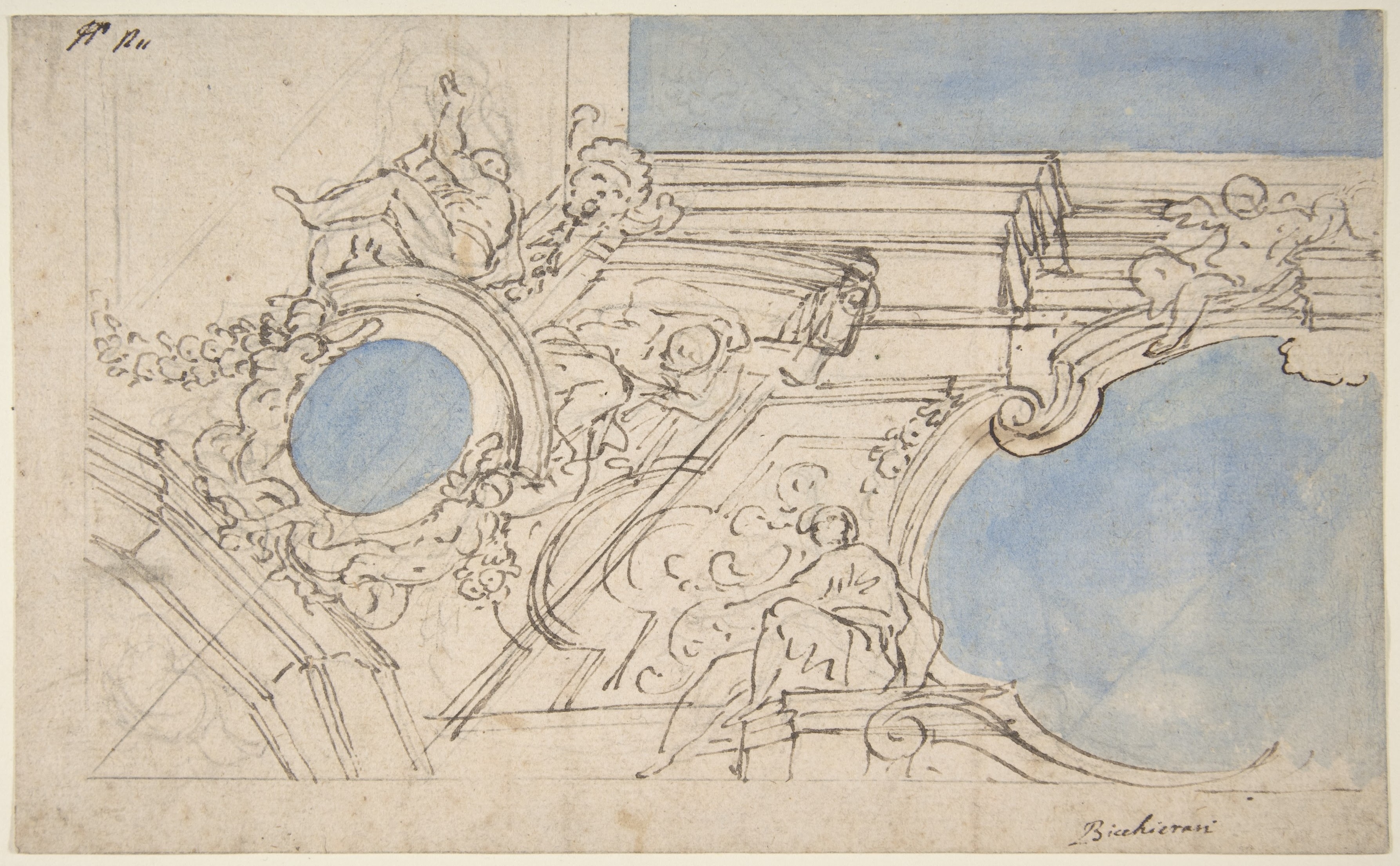 • Medium: Pen and brown ink brush and blue wash over traces of black chalk
