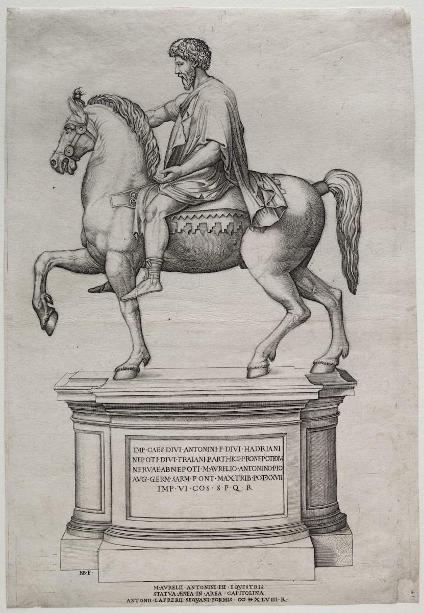 When Michelangelo redesigned the Campidoglio, a civic piazza on top of Capitoline Hill in Rome, he repositioned the ancient<em> Equestrian Statue of Marcus Aurelius</em> in the center of the piazza on a newly designed plinth with antique-style lettering. Just after the piazza was completed, Nicolas Beatrizet made this engraving of the statue and plinth as part of a series of prints of Roman monuments, which were often purchased by travelers to Rome. Michelangelo was uncredited in such images, but his impact on civic design gradually became part of the collective visual memory of Rome.