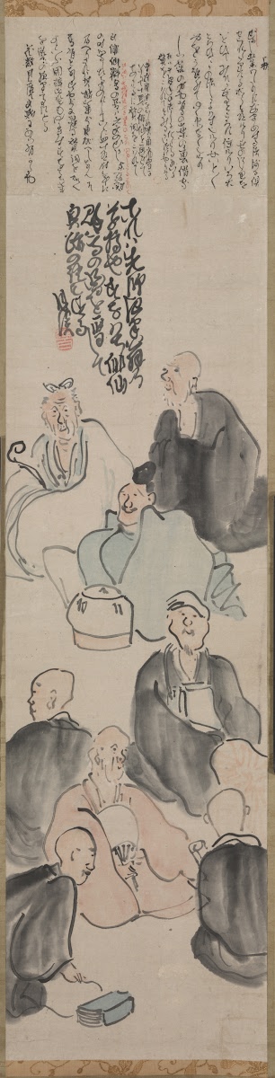 In Japan, both Chinese-style poems (<em>kanshi</em>) and Edo period Japanese poems (<em>haikai</em>) paralleled the Chinese literati and Japanese painting <em>haiga</em> traditions. Edo literati painter Matsumura Goshun painted eight poets from the anthology of 36 haikai poets compiled by his teacher Yosa Buson. When Buson died in 1783, Matsumura was asked to care for his teacher’s young daughter; Matsumura added paintings to Buson’s poetic writings to sell and raise money for her marriage. Here, he included Buson’s poem at the top of the painting.