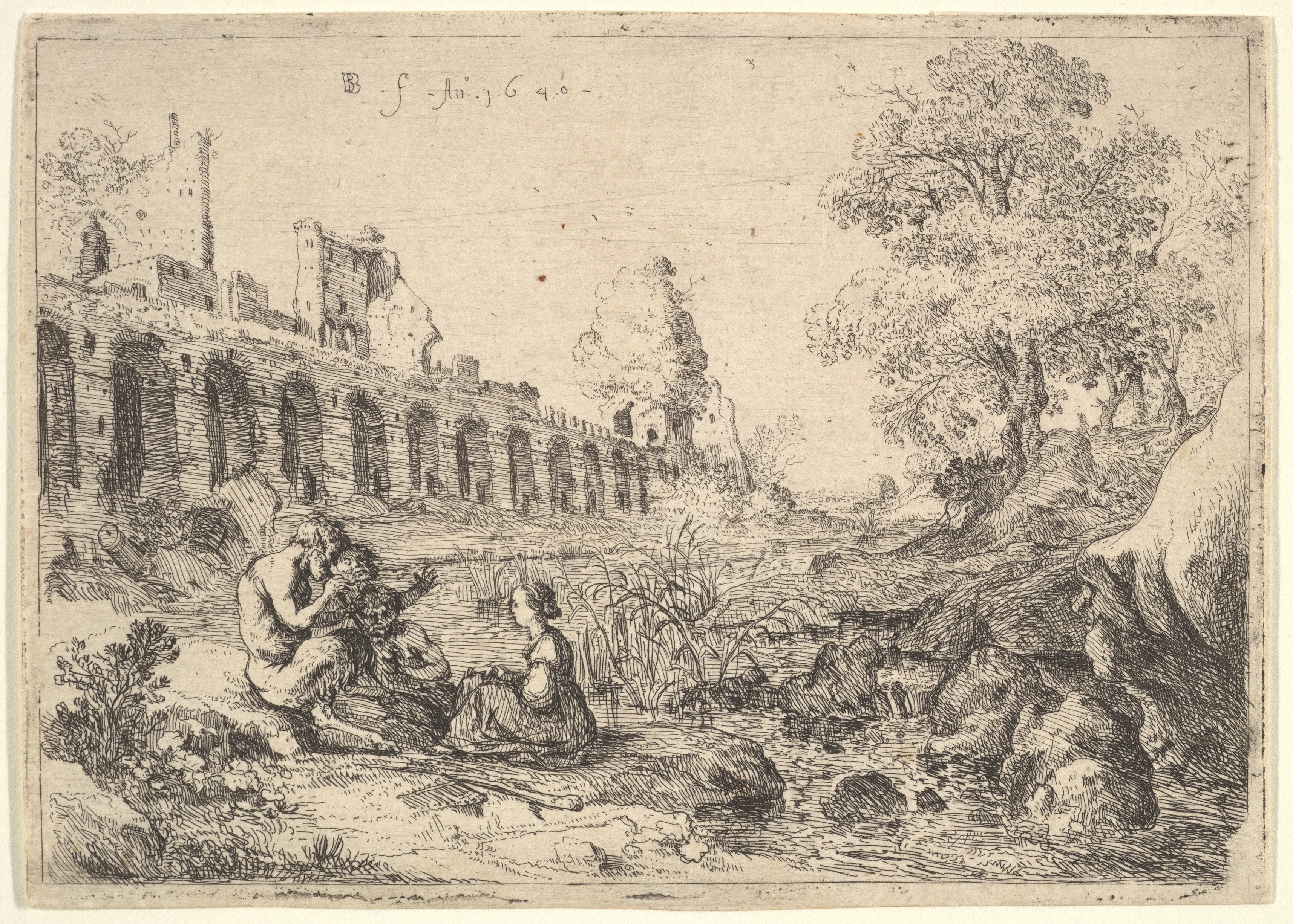 Corsica seated before satyrs on the bank of a river, from a pair of plates for Battista Guarini's 'Il Pastor fido'